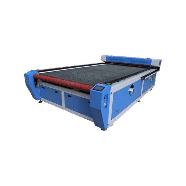 ماكينة CO₂ مخصصة لصناعة الستائر والجلود والنسيج. قدرة من 100W حتى 150W، مساحة عمل 1600×3000 مم، مزودة بنظام RD445 وتبريد CW5200. الوزن الكلي 1000 كجم.